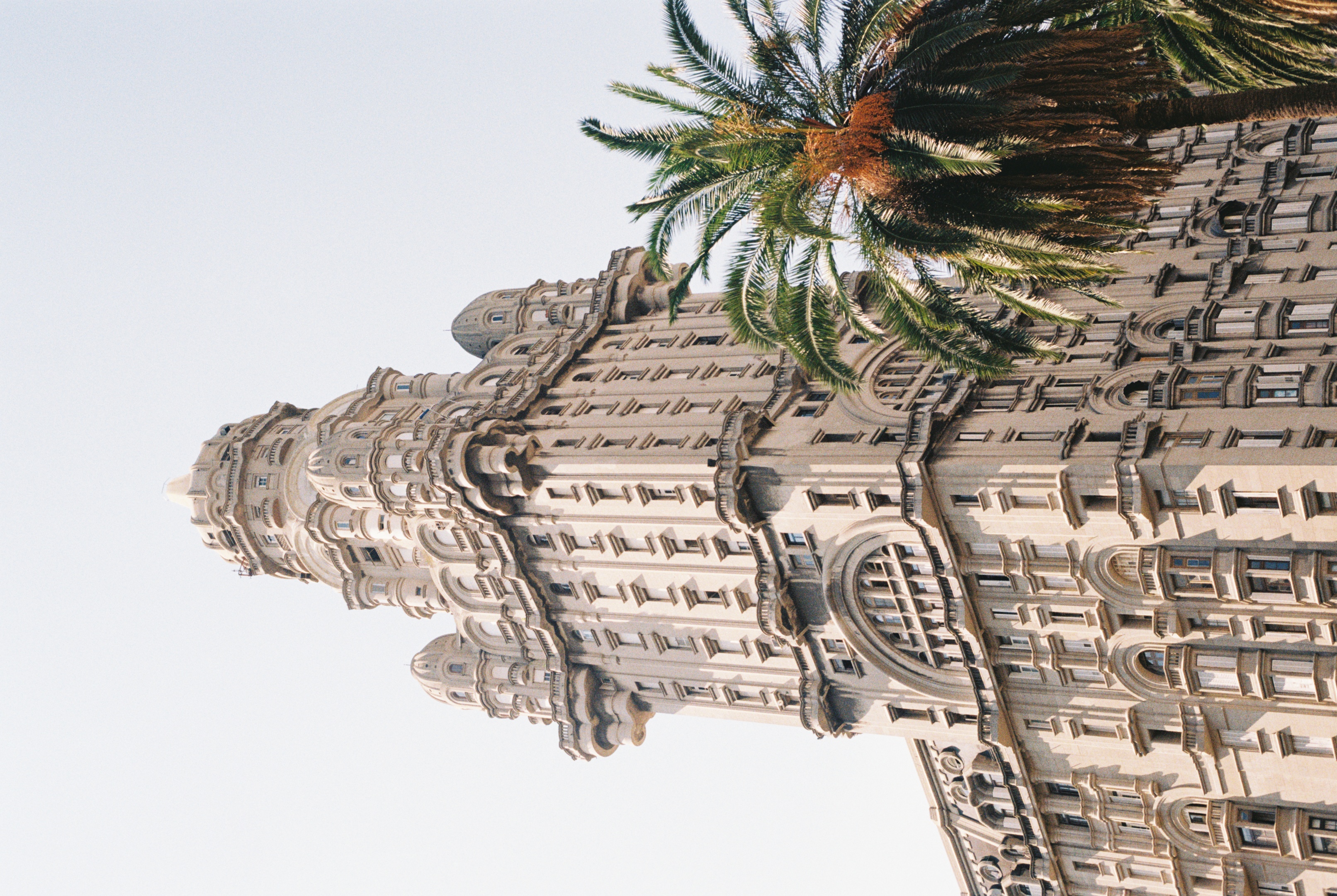Eventually the city opens out onto the Plaza Independencia, a chess set of green bushes, deep shadow, and park benches. The businesses at the bases of the heroic buildings facing in towards the central statue of General José Artigas have seen better days. A man, speaking English approaches me. We’re the only two souls on the square––perhaps the most famous in the entire country. He has his hand-out and is smiling. No way, not today, I think. I haven’t stopped walking since leaving the ship, and I dont stop now. Dodging him, I’m already passing into the next street where I do, finally, have to stop. Or at the very least slow down. For craning my neck upwards, there it is. The Palacio Salvo.
